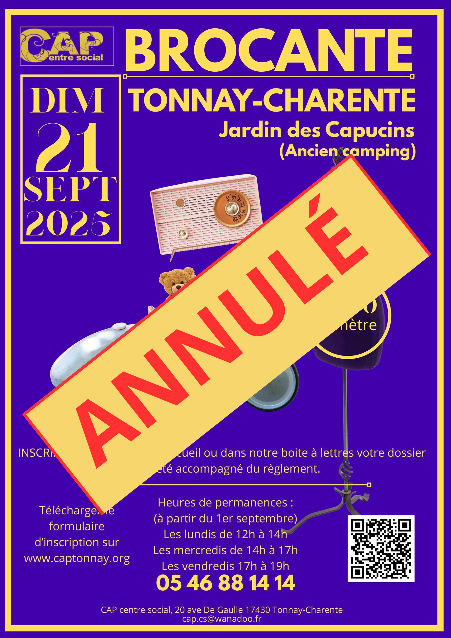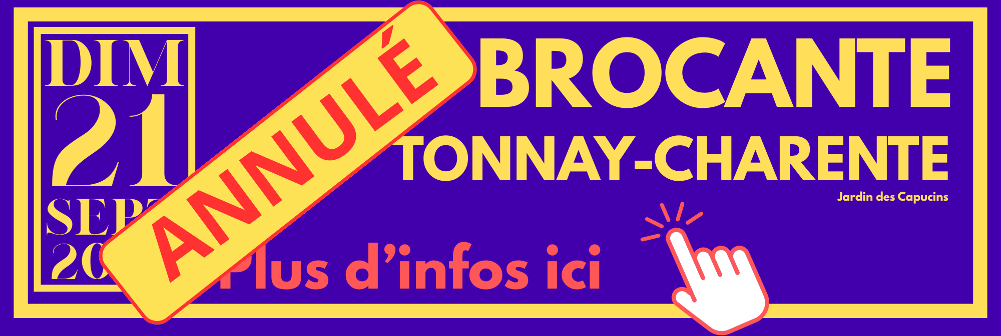 En raison des conditions météorologiques attendues dimanche 21 nous avons pris la décision d'annuler la brocante. |